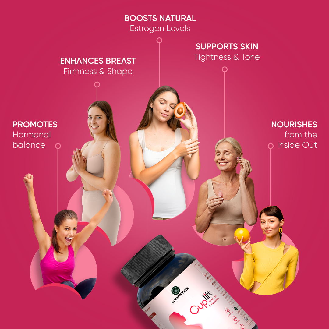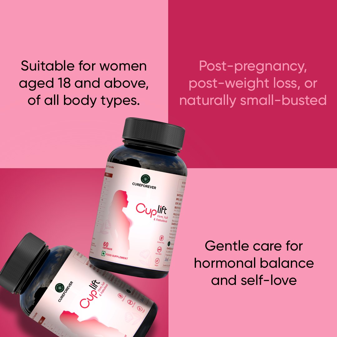 Cureforever Cuplift is a herbal supplement made with 6 natural ingredients like Shatavari, Pueraria Mirifica, Ashwagandha, Fennel, Fenugreek, and Gotu Kola to support bust firmness, shape, and overall skin elasticity naturally.