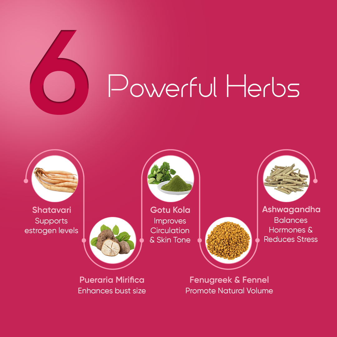 Shatavari and Gotu Kola work from within to keep the skin around the bust area smooth, soft, and elastic. This helps prevent loose skin while promoting a firm, toned look that complements your curves.