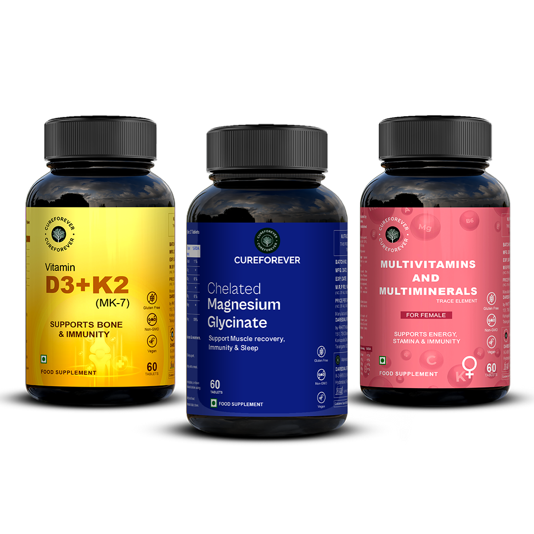 Support your body, mood, and energy every single day with this thoughtfully curated Everyday Essentials Combo for Women. A powerful trio of Multivitamin, Vitamin D3 + K2MK7, and Chelated Magnesium designed to fill daily nutritional gaps, support immunity, hormones, bones, muscles, sleep, and overall wellbeing, gently and consistently, because real wellness starts with daily basics done right.